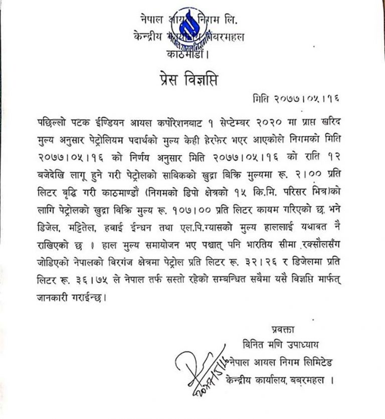१ सेप्टेम्बर ९आज०मा आएको मूल्यसूचीअनुसार पेट्रोलको मूलय बढाइएको निगम प्रवक्ता विनितमणि उपाध्यायले बताए ।