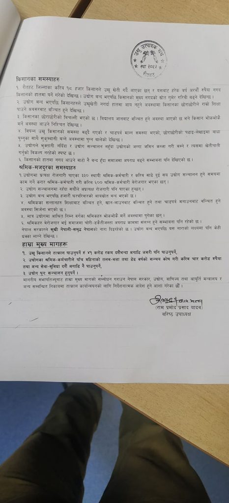 ज्ञापनपत्रमा भनिएको छ, उखु किसानले तत्काल पाउनुपर्ने रु ४१ करोड रकम दशैभन्दा अगाडि जसरी पनि पाउनु पर्दछ ।उद्योगका श्रमिक कर्मचारीले पाँच महिनाको तलबभत्ता तथा डेढ बर्षको सञ्चयकोष गरि करीब ४ करोड रुपैयाँ तथा अन्य सेवा सुबिधा दशैँ अगाडि नै पाउनुपर्ने । उद्योग पुन सञ्चालन हुनुपर्ने ।ु