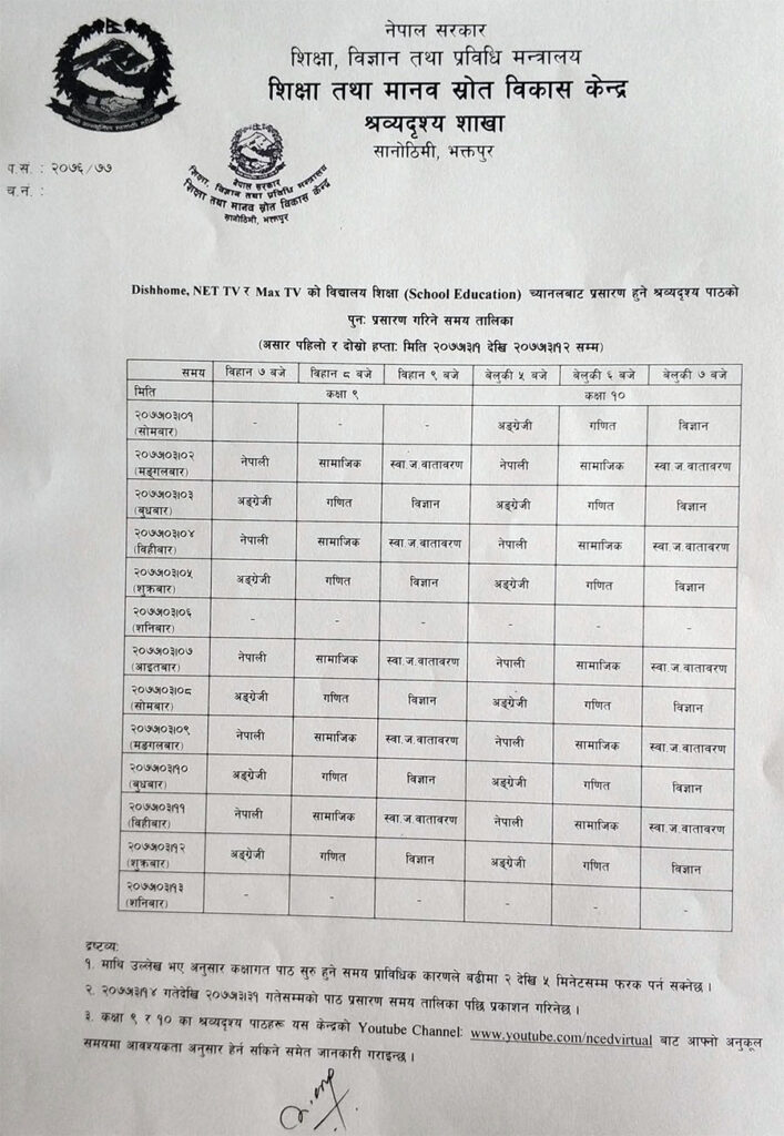 उनका अनुसार असार १ गतेदेखि असार ३१ गतेसम्म विषयगत पाठहरु नेपाल टेलिभिजनको एनटिभी प्लसबाट पढाइ हुने छ । यस्तै कक्षा ९ / १० को विषयगत पाठहरु भने डिस होम, नेट टिभी, म्याक्स टिभीको स्कुल एजुकेसन च्यानलबाट प्रसारण हुने छ ।