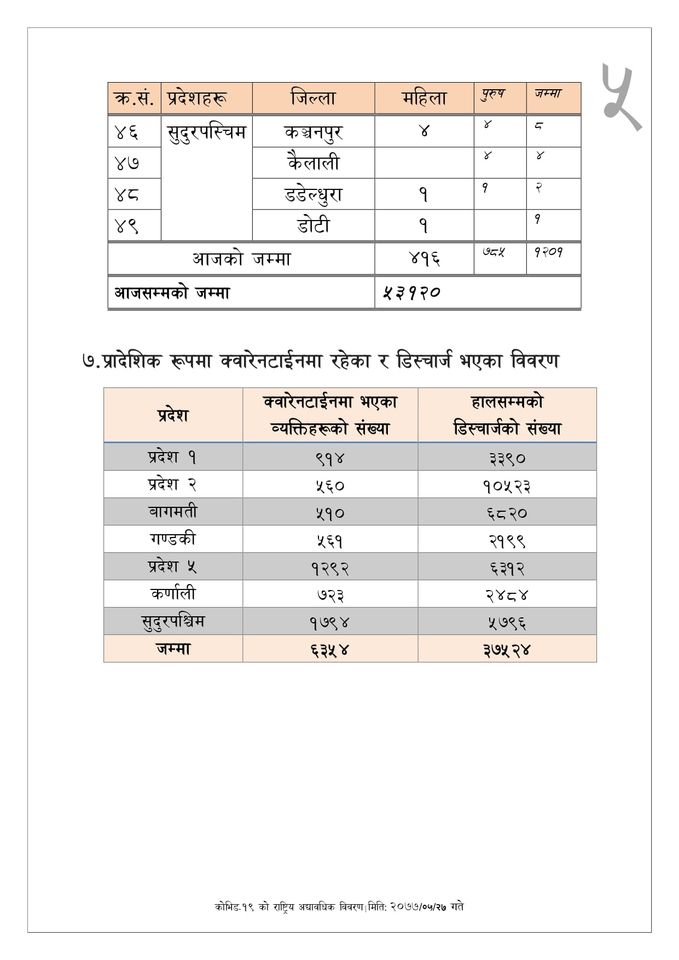 मन्त्रालयका अनुसार आज ८ सय ५२ जना डिस्चार्ज भएसगै आजसम्म घर फर्किनेको संख्या ३७ हजार ५ सय २४ जना रहेको छ ।