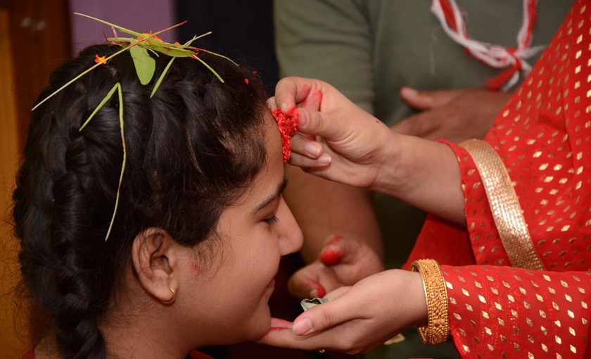 विजयादशमी : मान्यजनको हातबाट नवदुर्गाको प्रसादका रुपमा शुभ साइतको प्रतीक रातो टीका एवं समृद्धिको प्रतीक जमरा लगाएर मनाइँदैछ ।