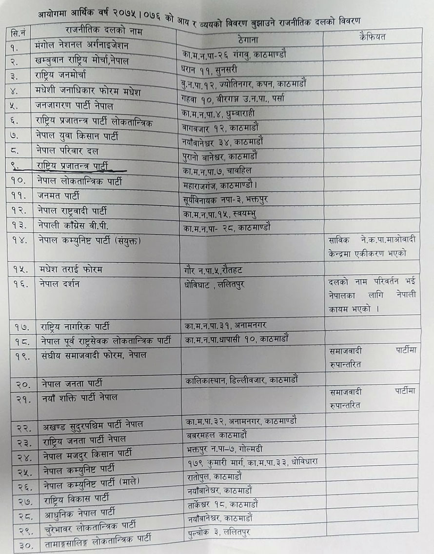 संघीय संसदमा प्रतिनिधित्व गर्ने नेपाल कम्युनिस्ट पार्टी नेकपा नेपाली कांग्रेस, जनता समाजवादी पार्टी लगायतका ठूला दलले भने आव ०७५/७६ को आयव्यय विवरण समयमै बुझाएका छन् । तर, अघिल्लो आव ०७६/०७७ को विवरण भने कुनै पनि राजनीतिक दलले बुझाएका छैनन् ।