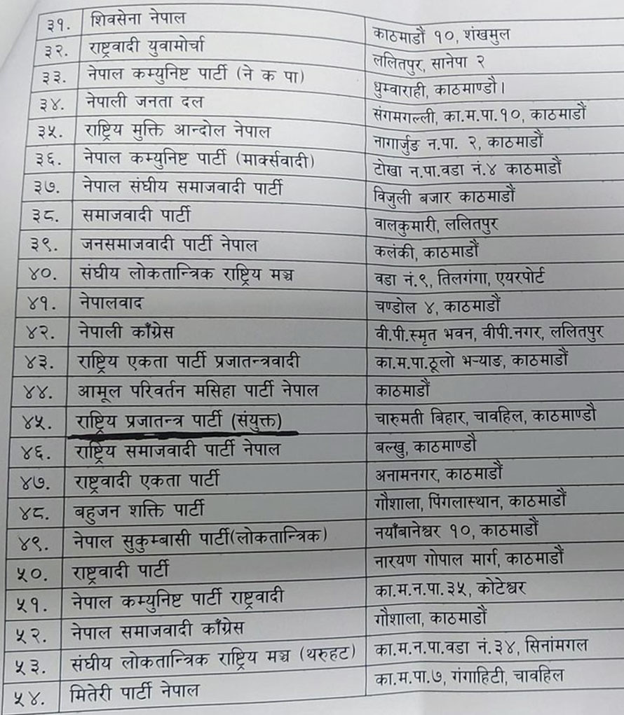 निर्वाचन आयोगले उपलब्ध गराएको आयव्यय विवरण बुझाउने ५४ दलको सूचीमा रवीन्द्र मिश्र नेतृत्वको साझा पार्टी छैन ।