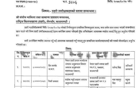नेपाल प्रहरीले ७ जना प्रहरी उपरीक्षक एसपीको सरुवा गरेको छ । प्रहरी महानिरीक्षक शैलेश थापा क्षेत्रीले मंगलबार प्रहरी उपरीक्षक एसपी र प्रहरी नायब उपरीक्षक डीएसपी सरुवाको निर्णय गरेका हुन् । प्रहरी प्रधान कार्यालयका अनुसार जिल्ला प्रहरी कार्यालय चितवनका प्रमुख एसपी नान्तीराज गुरुङलाई अन्तर्राष्ट्रिय विमानस्थल सुरक्षा कार्यालय, काठमाडौंमा सरुवा गरिएको छ । जिप्रका चितवनमा एसपी ओमप्रसाद … Continue reading राजनीतिक उतारचढावकाबीच ७ एसपीको सरुवा, को कहाँ ? (सूचिसहित)