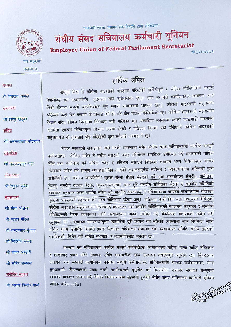 संघीय संसद सचिवालय कर्मचारी युनियनले अत्यावश्यक बाहेक संसदीय समितिका बैठक नराख्न माग गरेको छ ।