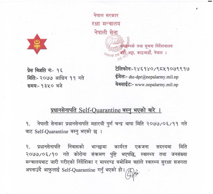 स्वास्थ्य तथा जनसंख्या मन्त्रालयबाट जारी गरिएको निर्देशिका र मापदण्ड अनुसार स्वास्थ्य सुरक्षा सजगता अपनाउँदै प्रधानसेनापति थापा होम क्वारेन्टिनमा बसेको सैनिक जनसम्पर्क तथा सूचना निर्देशनालयले जनाएको छ ।