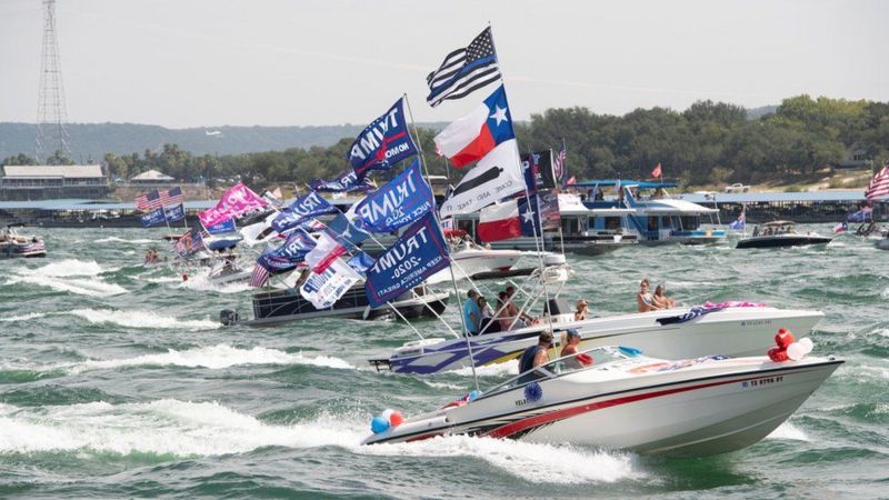 अमेरिकी राज्य टेक्ससको एउटा तालमा राष्ट्रपति डोनल्ड ट्रम्पको समर्थनमा आयोजित परेडमा सहभागी भएका कैयन् डुङ्गा डुबेका छन्।